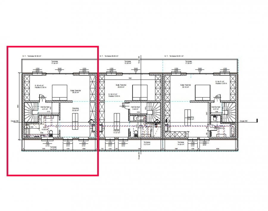 Au deuxième étage, vous trouverez un hall de nuit menant à une spacieuse suite parentale. Celle-ci dispose de son propre dressing, d'une salle de bains privative et d'un accès direct à une agréable terrasse de 17,64 m², parfaite pour créer un espace intime et relaxant.